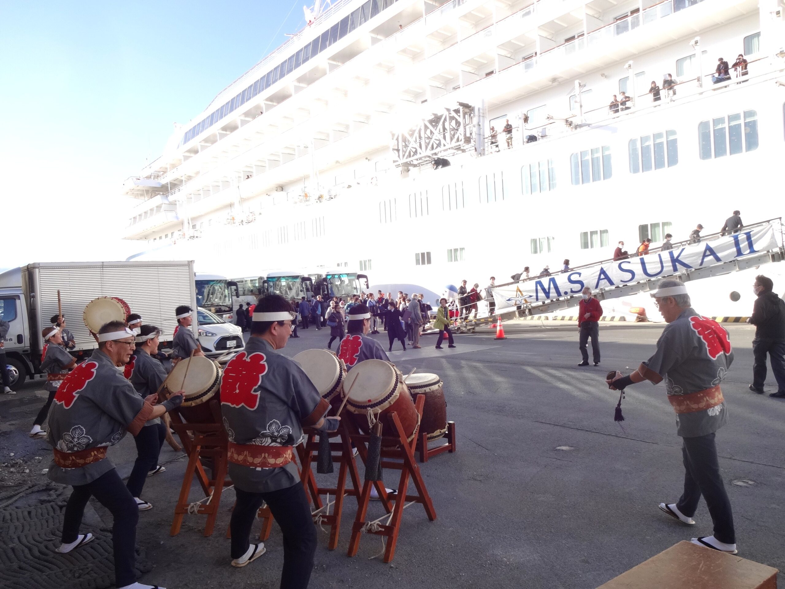 四日市港への飛鳥Ⅲ初入港を歓迎し、笛や太鼓の演奏で皆様をお迎えします。